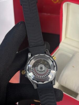 The combination of black and yellow gold gives the watch a bold and elegant look. The black ceramic dial, with its wave pattern, pays homage to the ocean, while the gold accents add a touch of luxury. The unidirectional rotating bezel, also in gold, ensures durability and functionality for diving purposes.