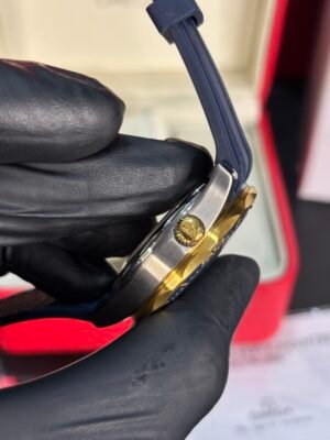 Refined yet rugged, the Omega Seamaster Diver 300M blue-Gold Dial offers a sophisticated twist on a legendary dive watch. With its sun-brushed blue-grey ceramic dial, this model brings a cool, modern aesthetic to the iconic Seamaster design, enhanced by the signature laser-engraved wave pattern that captures the spirit of the sea.