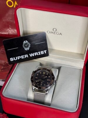 The 42mm case is made from grade 2 titanium, offering superior strength and lightness—ideal for covert missions or everyday wear. It features a tropical brown aluminum dial and bezel, evoking a retro patina while maintaining Omega’s professional dive-watch standards. The dial is marked with aged Super-LumiNova®, giving it a warm, vintage glow in all lighting conditions.