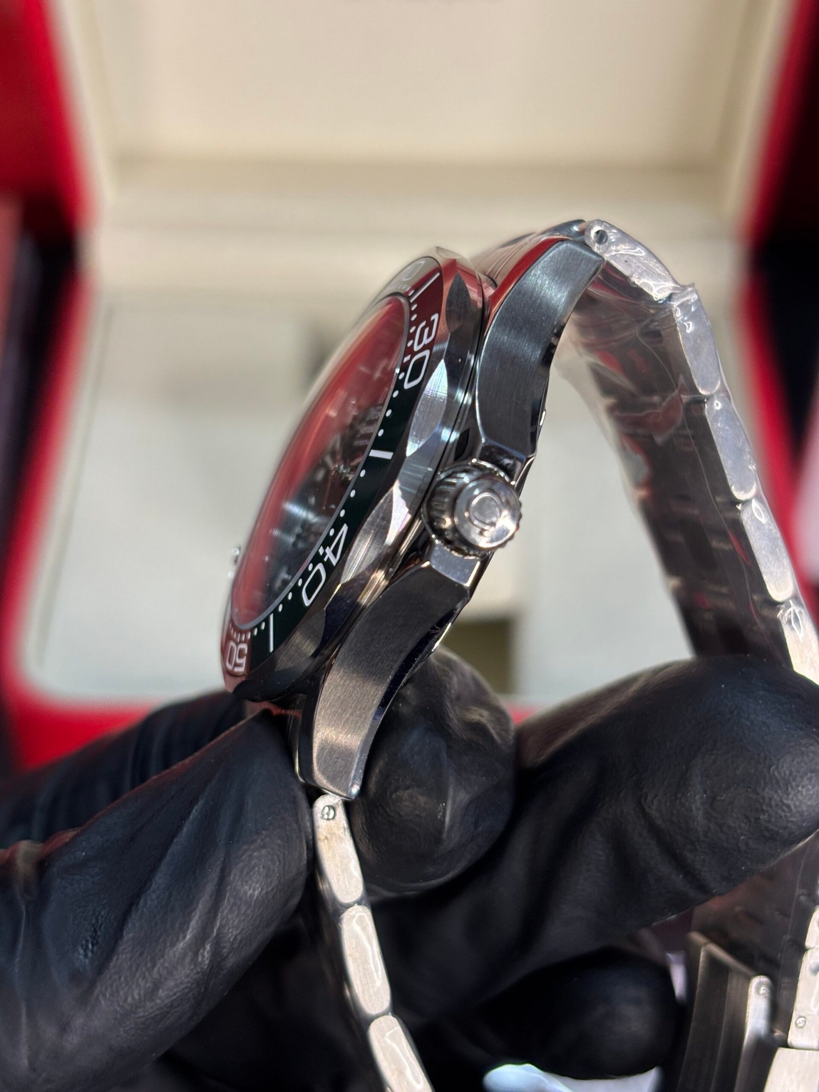 Water-resistant to 300 meters (1000 feet) and equipped with a screw-in crown and helium escape valve, this timepiece is built for serious diving, yet stylish enough for any occasion. The silver and green aesthetic offers a contemporary twist, making it a standout choice for collectors and adventurers alike.
