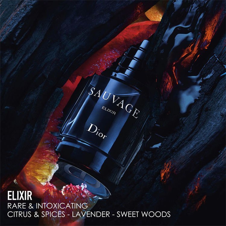 Sauvage Elixir by Christian Dior is a bold, ultra-concentrated fragrance with intense depth and power. It opens with a sharp, spicy burst of cinnamon, nutmeg, and cardamom, followed by a rich, aromatic heart of lavender. The scent settles into a dark, commanding base of amber, licorice, and woody notes, leaving an extremely long-lasting and masculine trail.